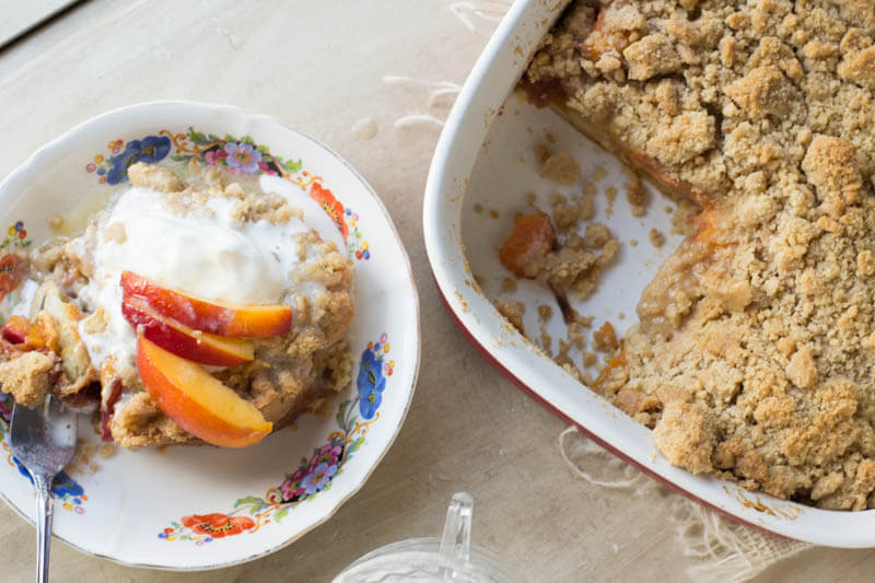 - Sprinkle: Add the peaches over the top of the bread and then sprinkle the crumble topping all over the top.