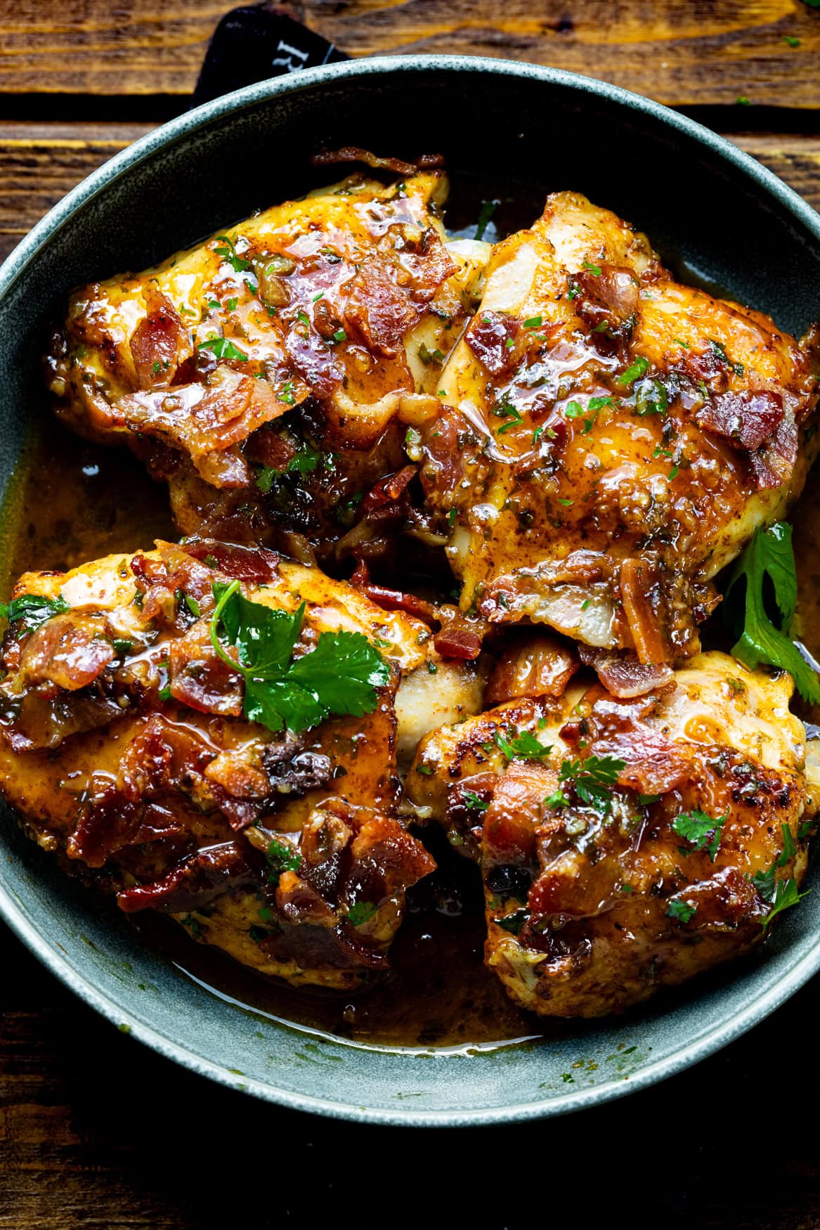 a photo of a skillet with 4 golden chicken thighs topped with bacon and chopped parsley