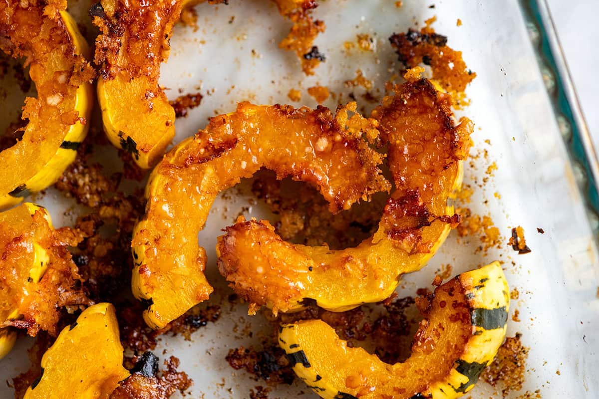 We roast delicata squash slices with melted butter, parmesan cheese, and garlic. Since we roast the squash slices on top of the cheese and garlic, they melt down to create a lovely, cheesy crust on the bottom of each slice. They look beautiful and taste amazing.
