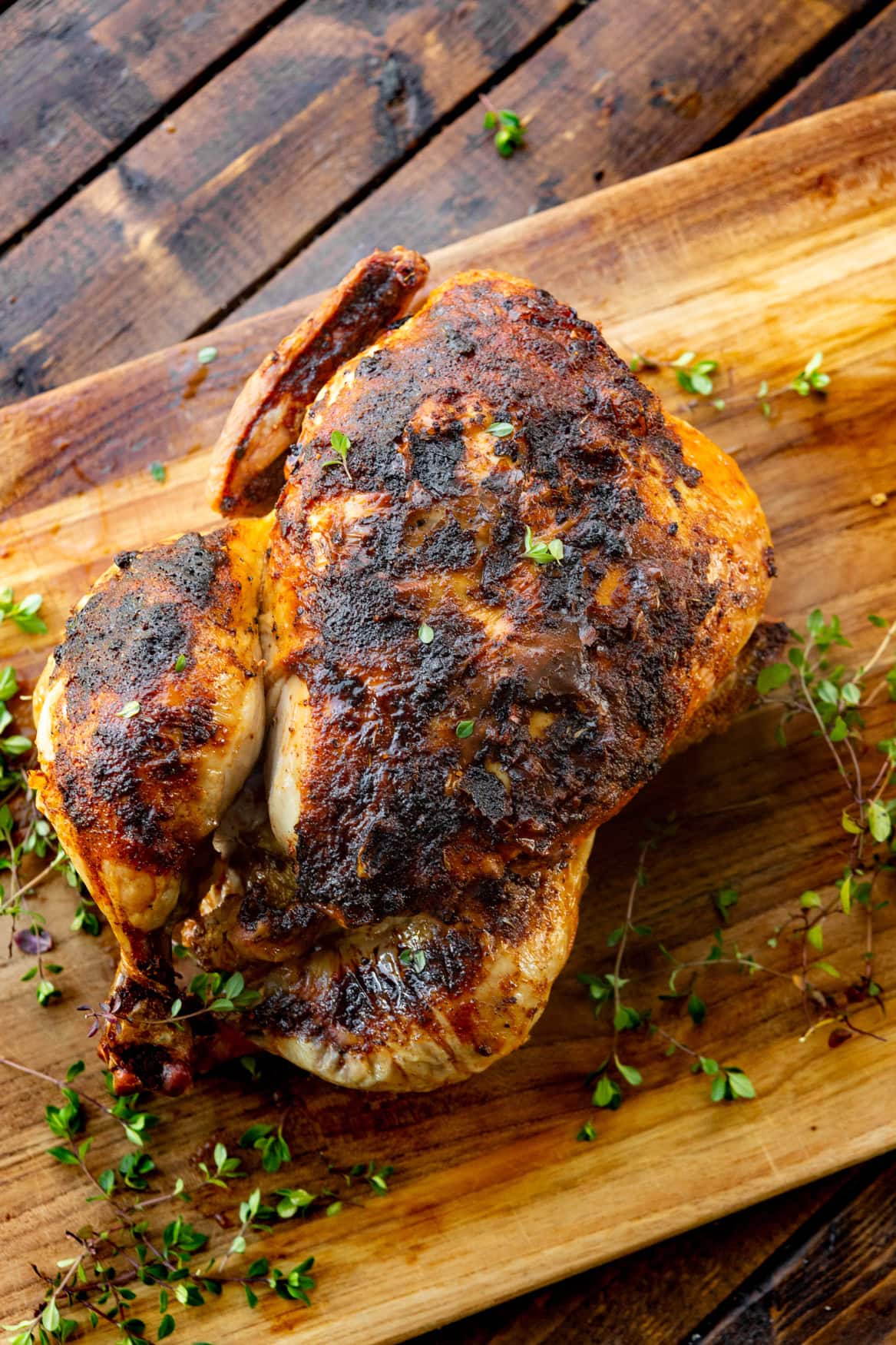 We love the simple combination of smoked paprika, salt, garlic powder and fresh thyme, but you can definitely experiment with different seasonings. You can change up the fresh herbs and use rosemary, basil, oregano, and/or sage. You could also add some lemon zest for a bright citrus burst of flavor. If you want to use the chicken for a Mexican meal, use cumin, chili powder or a taco seasoning blend. The options are really endless!