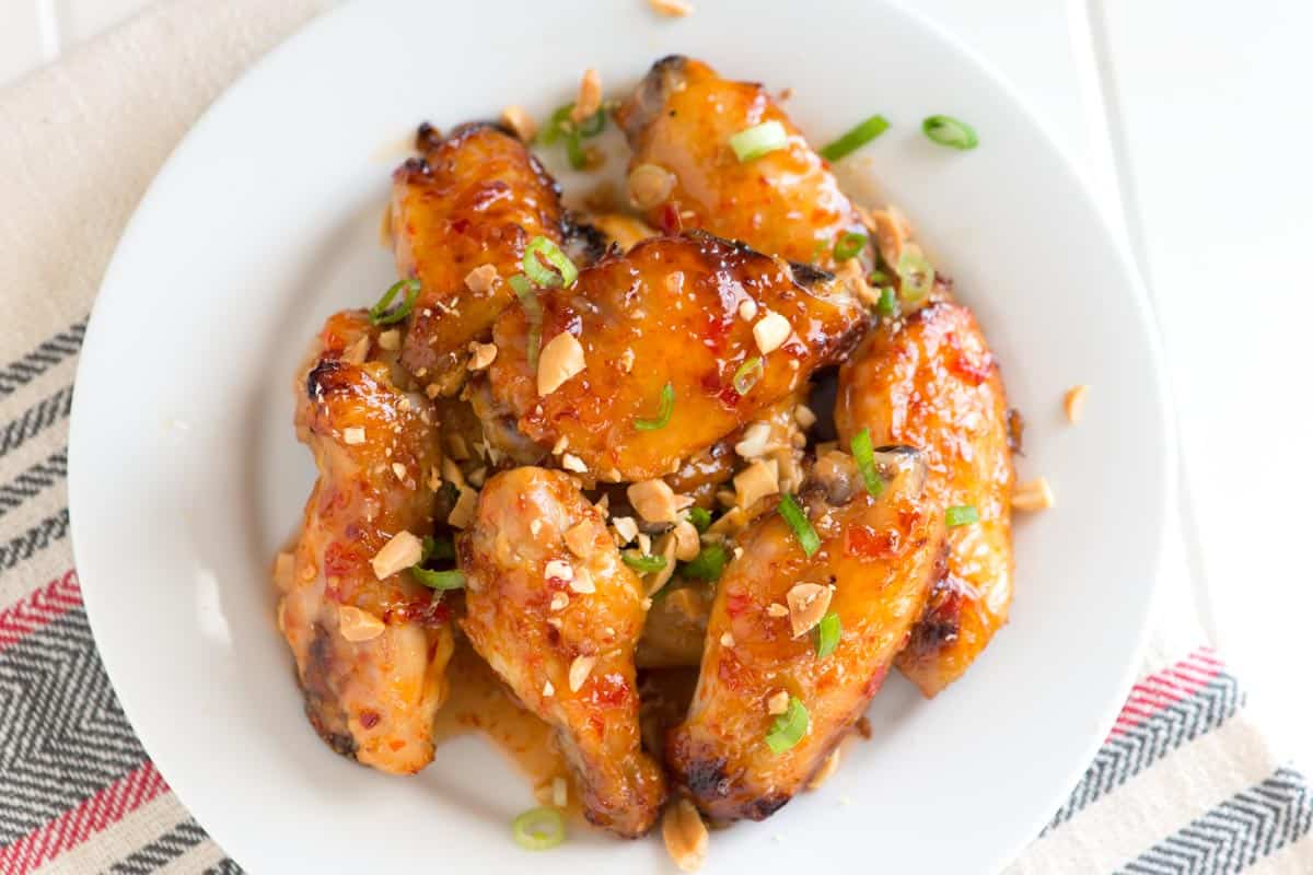 Our sweet chili wings are sticky, sweet, and spicy, with a bit of crunch, thanks to a handful of chopped peanuts and sliced green onion sprinkled on top. They are easy, too. The sweet chili glaze only needs three ingredients!