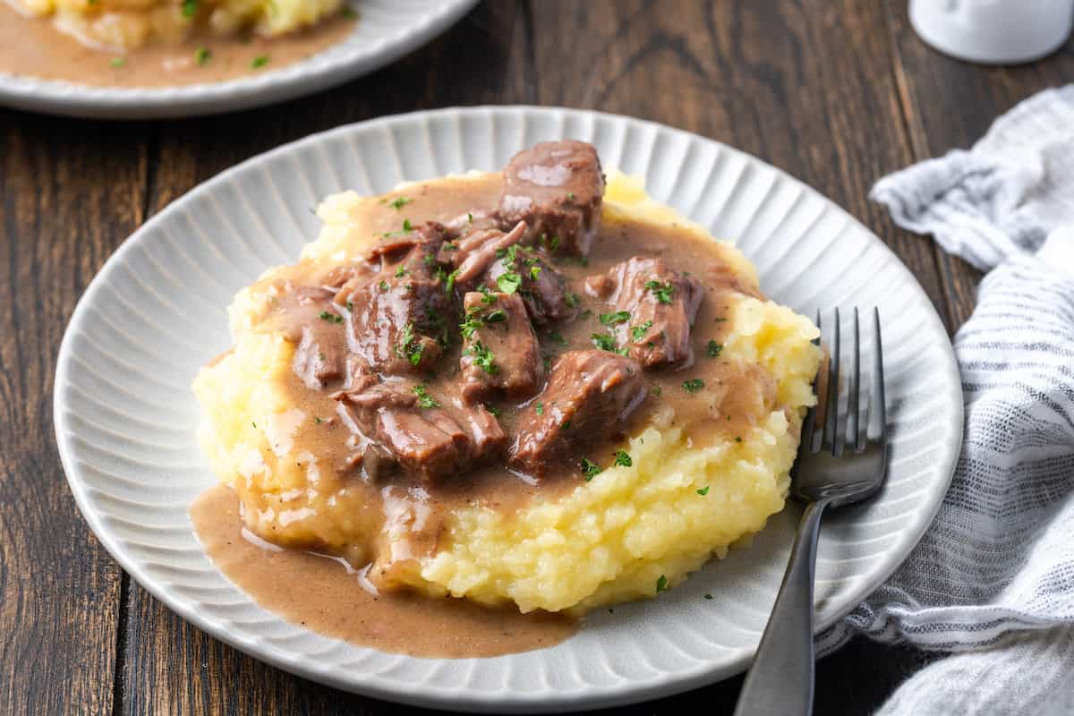 My favorite way to serve my no peek beef tips is over a bed of creamy mashed potatoes drenched in spoonfuls of mushroom gravy. There’s nothing more comforting on a cold winter evening! You can also combine the beef tips and sauce with egg noodles for a dinner that’s similar to beef stroganoff, or serve them with rice or risotto. Add a side of asparagus or roasted carrots, and beer bread or biscuits for sopping up the leftover gravy.