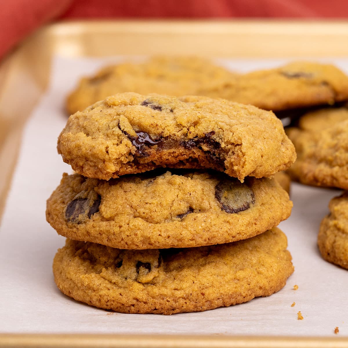 These gluten free pumpkin chocolate chip cookies are crispy on the edges, chewy in the center, and packed with pumpkin flavor.