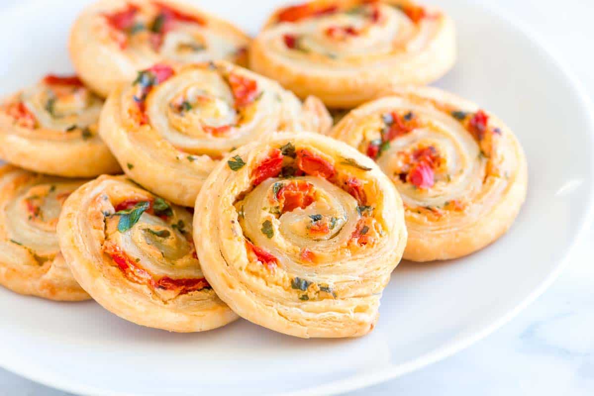 These puff pastry pinwheels are high on my list of best hors d’oeuvres. They are simple, pretty on the plate, taste incredible, and are perfect for making in advance! In our recipe below, we spread puff pastry with Boursin cheese, add lots of parmesan, and top with roasted red pepper for sweetness and color.