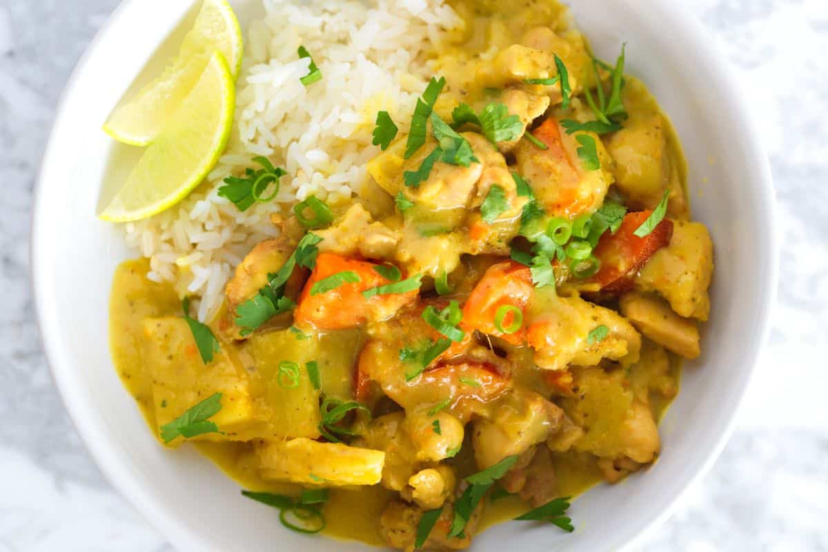 Everyone in my family loves this yellow chicken curry! We honestly can’t get enough of it. Tender chicken and potatoes simmer in a rich coconut and yellow curry sauce. It’s incredible!