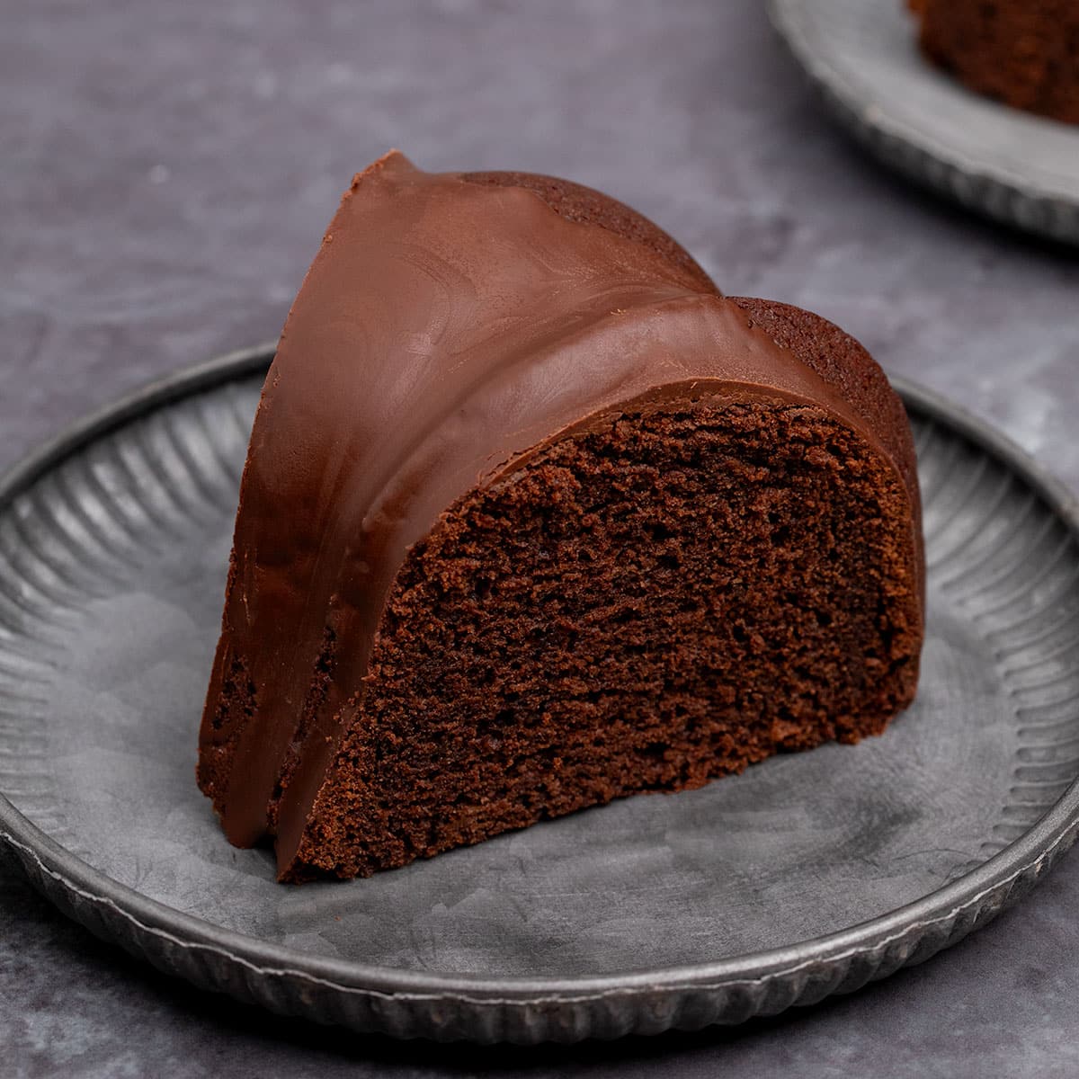 side view of slice of dark brown chocolate bundt cake on dark gray fluted cake plate with rest of cake on white cake plate in backgroundside view of slice of dark brown chocolate bundt cake on dark gray fluted cake plate with rest of cake on white cake plate in background