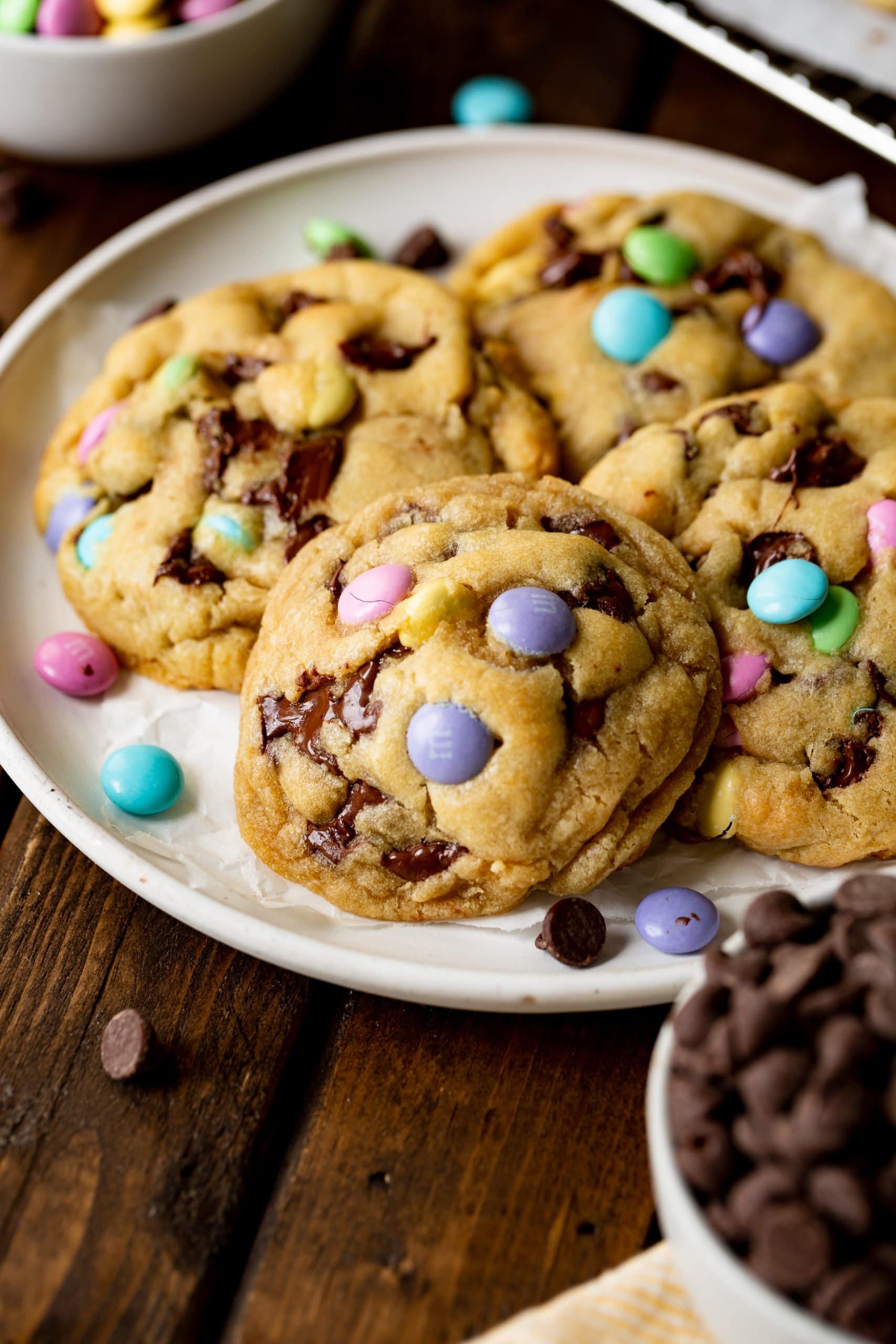 a photo of a white serving plate full of thick and golden Easter m&m chocolate chip cookies.