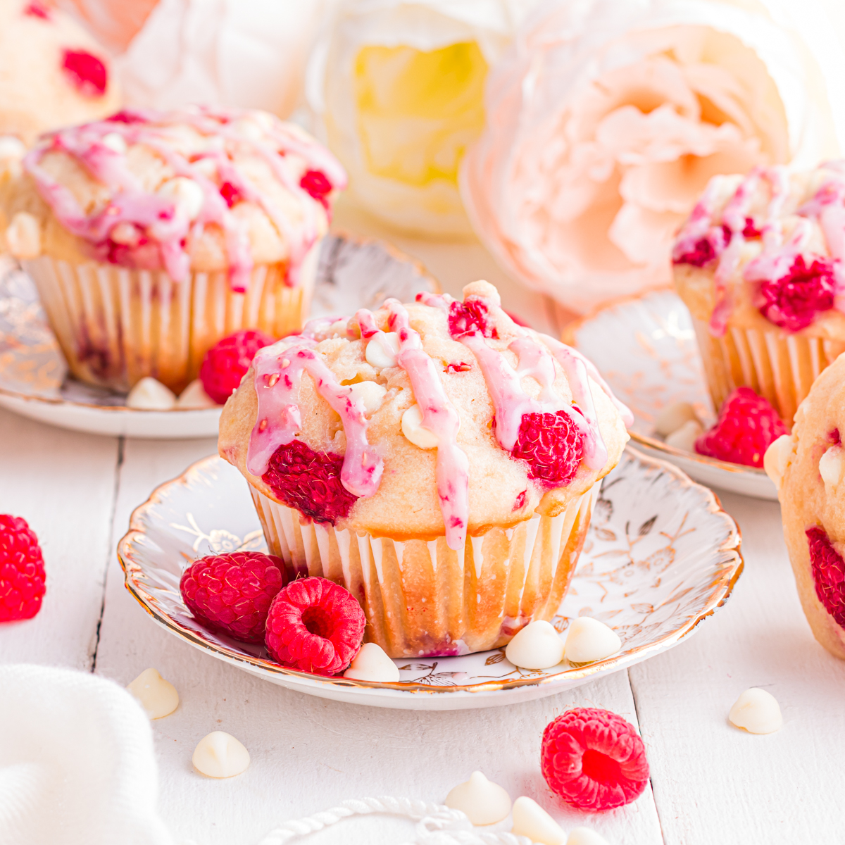 These Raspberry White Chocolate Muffins are bakery-style perfection! Bursting with juicy raspberries and creamy white chocolate chips, they’re tender, fluffy, and topped with a raspberrry drizzle.