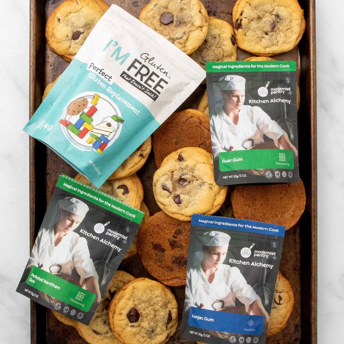 dark brown baking sheet with gluten free chocolate chip cookies and packages of xanthan gum, guar gum, konjac powder, and perfect gluten replacement on top