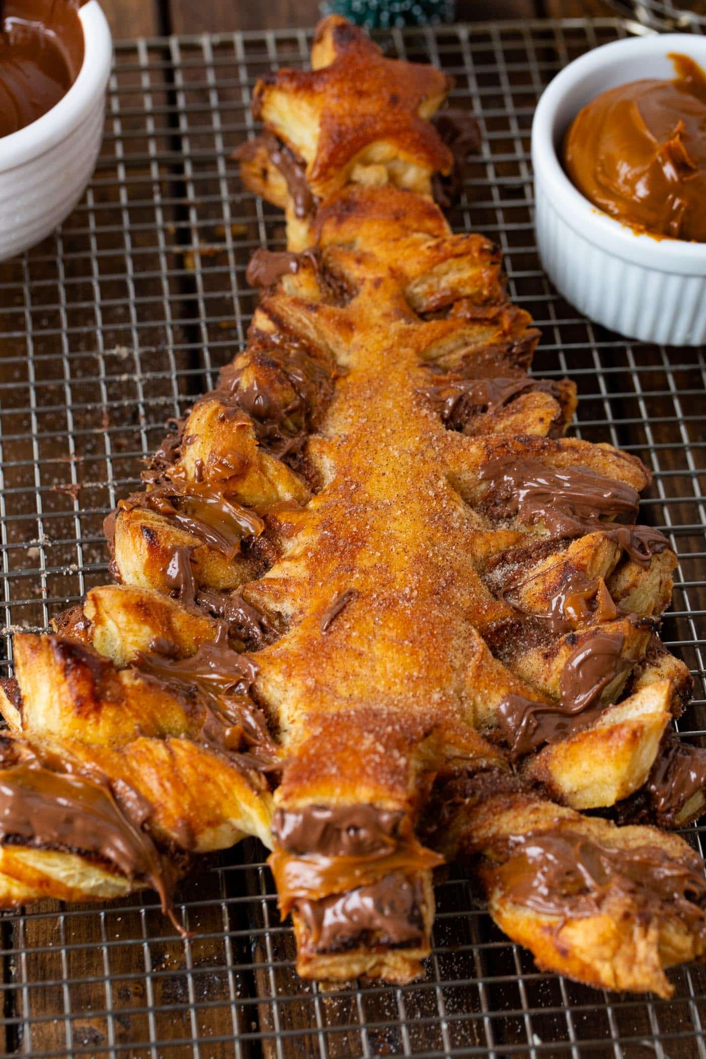 - Top: Using leftover pastry scraps, cut a star shape. Spread Nutella on one piece and dulce de leche on the other, press together, and place at the top of the tree.