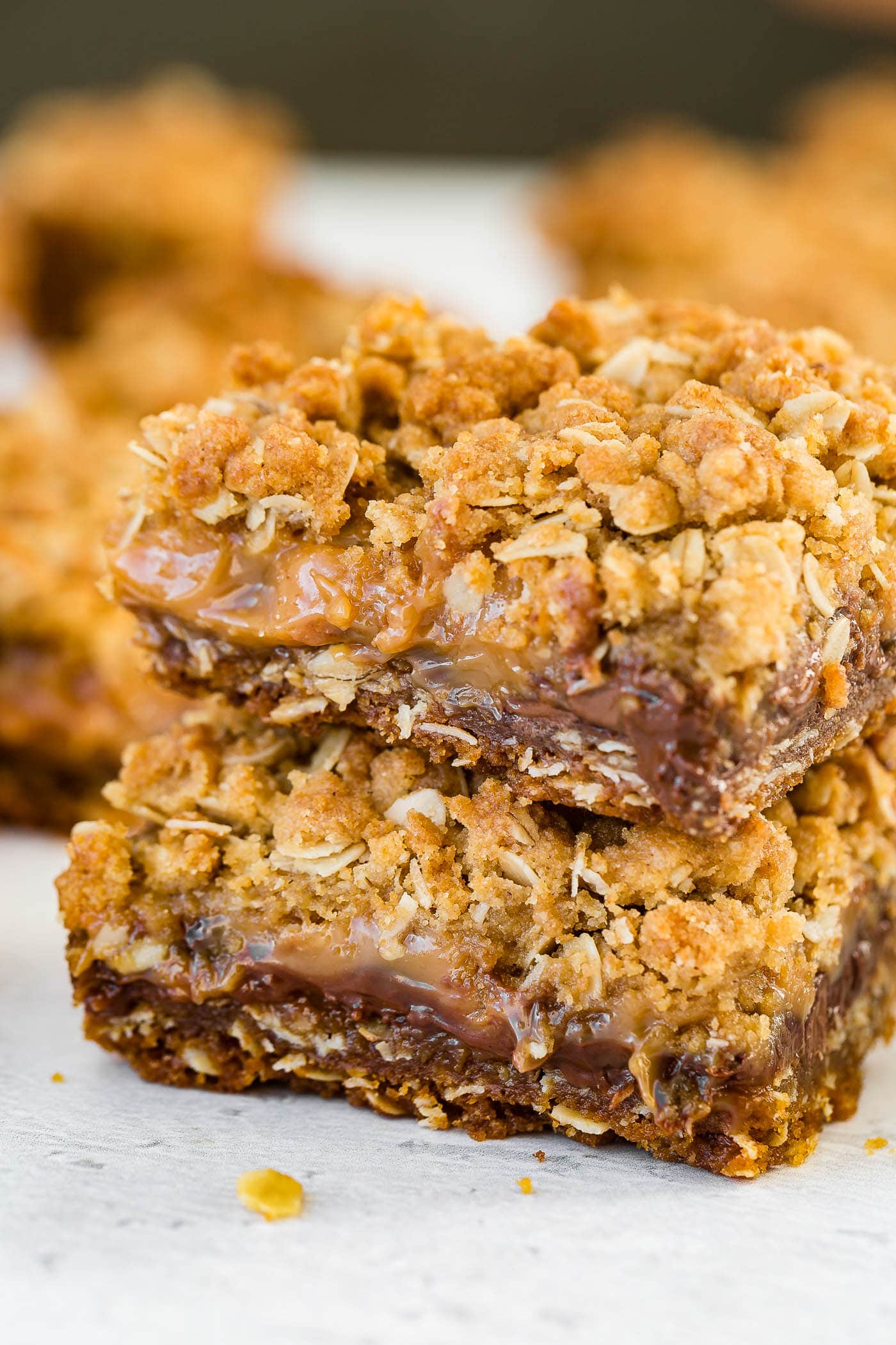 A stack of carmelitas with chocolate, caramel and an oat crumbleA stack of carmelitas with chocolate, caramel and an oat crumble