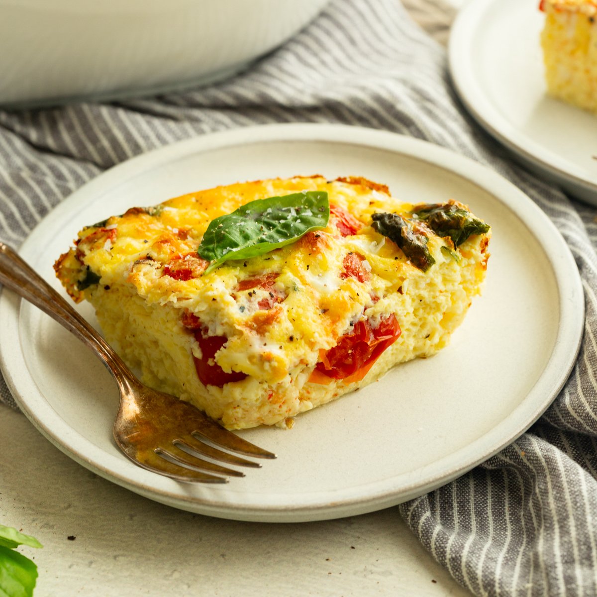 This healthy cottage cheese egg bake is a high protein breakfast recipe from both eggs and cottage cheese! Our fluffy and flavorful breakfast casserole is so easy to make with just a handful of ingredients (eggs, cottage cheese, tomatoes, basil cheese, and roasted red bell pepper) in less than 50 minutes!